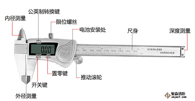 游标卡尺量程不小于150m;精度:0.02mm消防水管件,灭火器直径等...