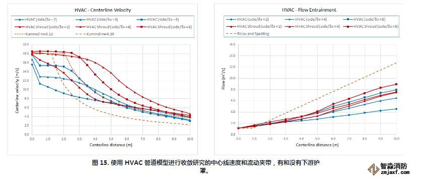 HVAC 模型的结果如图 15所示。对于没有护罩的 HVAC 模型,我们可以看到出口处气流的初始横向膨胀(图表中的蓝线)。结果都显示出比实验拟合更少的流动夹带,护罩模型的更细网格具有接近的匹配。